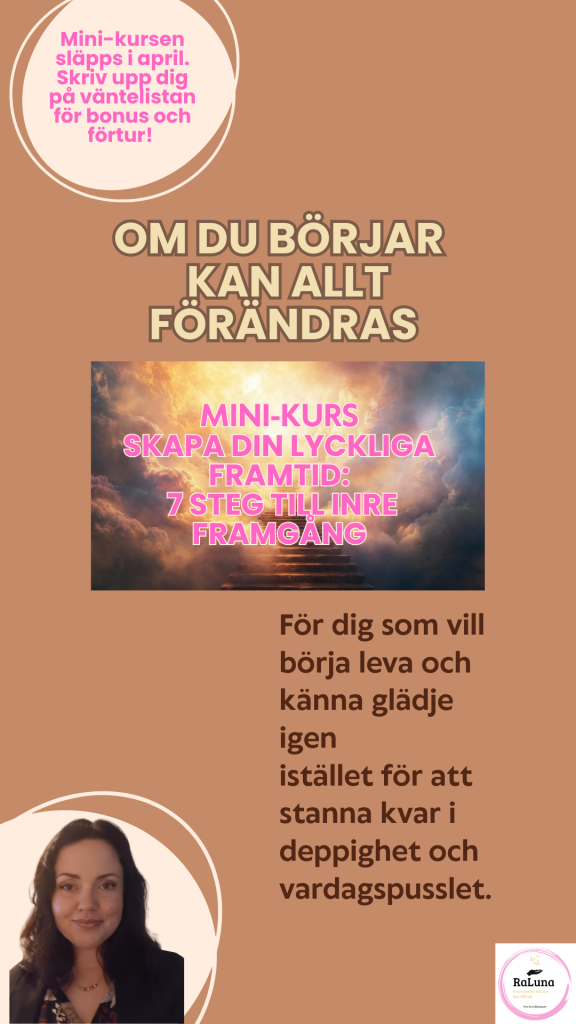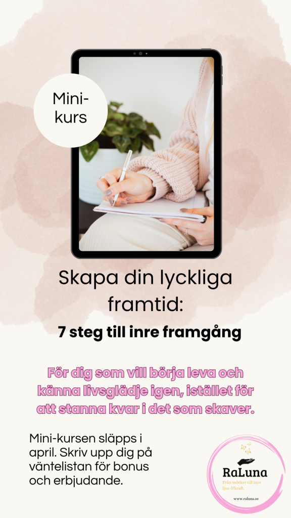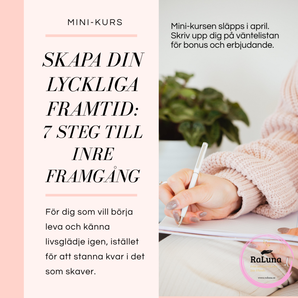Som jag nämnde förra veckan så skapar jag för fullt på minikursen “Skapa din lyckliga framtid: 7 steg till inre framgång”. Det har varit en helande resa bara att skriva ner de här stegen till dig. Namnet kom till mig som en påminnelse om att framtiden inte är något som bara händer oss – det är något vi skapar inifrån, steg för steg.